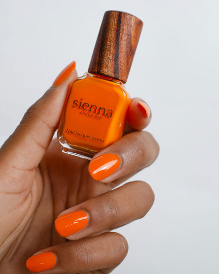 Bright papaya Orange nail polish swatch on medium skin tone by Sienna Byron Bay