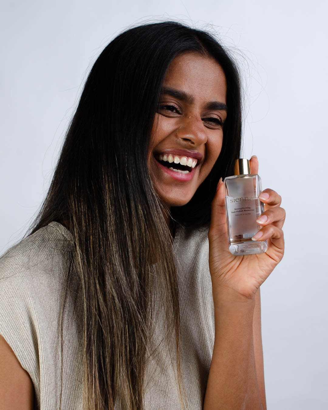 Medium skin tone woman laughing holding Sienna Strengthening Nail Polish Remover